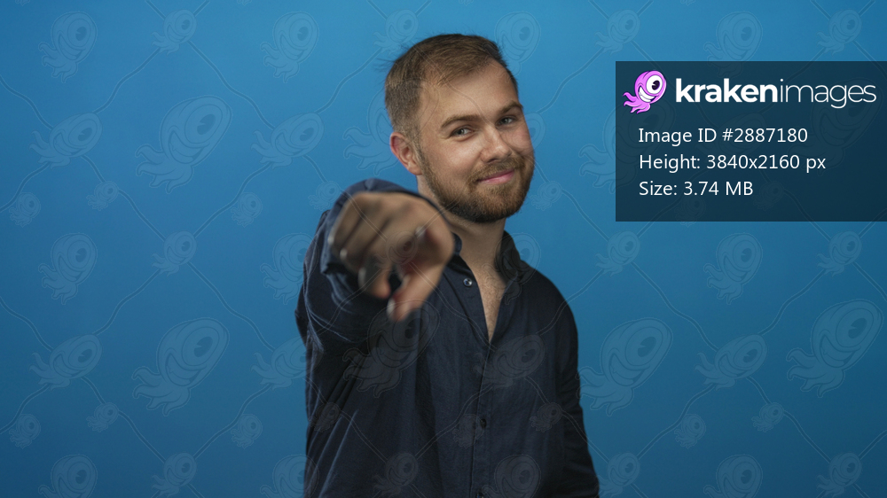 Young man in navy shirt points finger at camera in studio with blue backdrop, smiling and making eye contact; confidence.