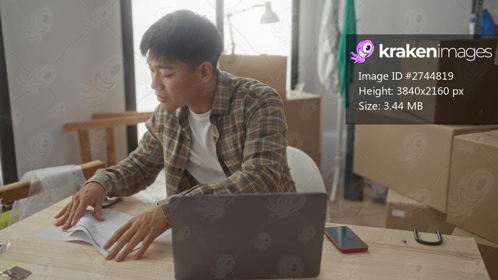 Young man in new apartment with laptop and boxes around, reviewing papers, symbolizes moving process and excitement.