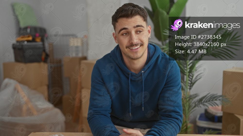 Young man in new home living room, indoors, wearing hoodie, smiling, talking to camera, surrounded by moving boxes, plants, and unpacked items, hispanic ethnicity. - Kraken Images
