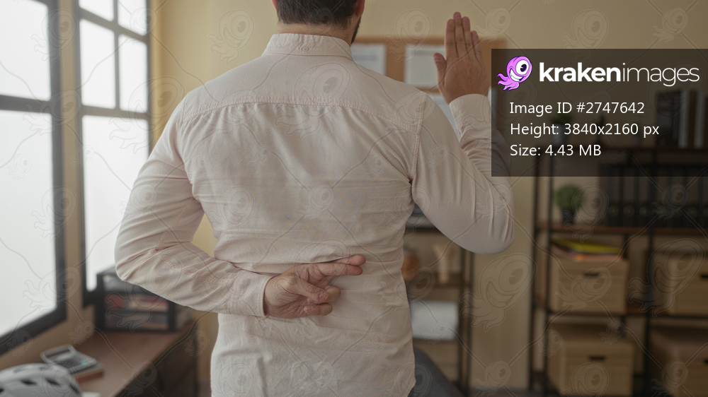 Young man in office making an oath with fingers crossed behind his back symbolizing deceit in a professional setting.