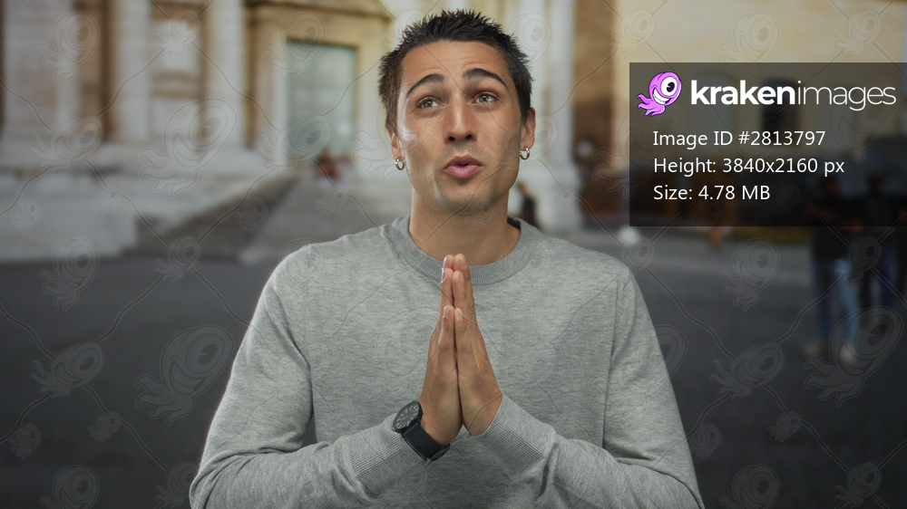Young man in old town outdoors, gesturing with hands in prayer near historical architecture, conveying hope and peace.