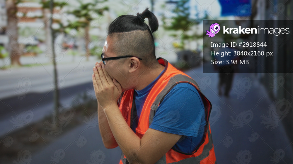 Young man in orange reflective vest covering mouth with hands on city street; safety concern anxiety.