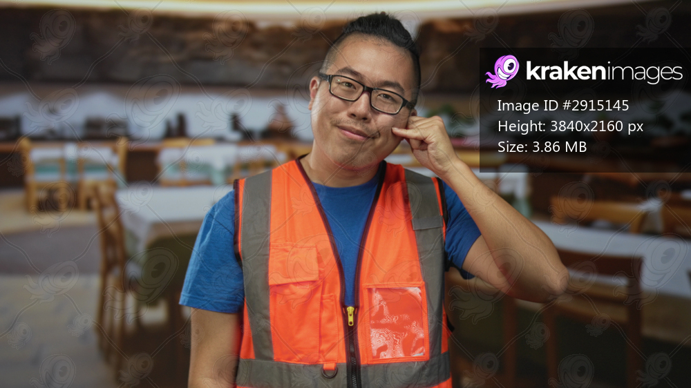 Young man in orange reflective vest pointing at thumb to ear phone gesture and smiling in building; playful.