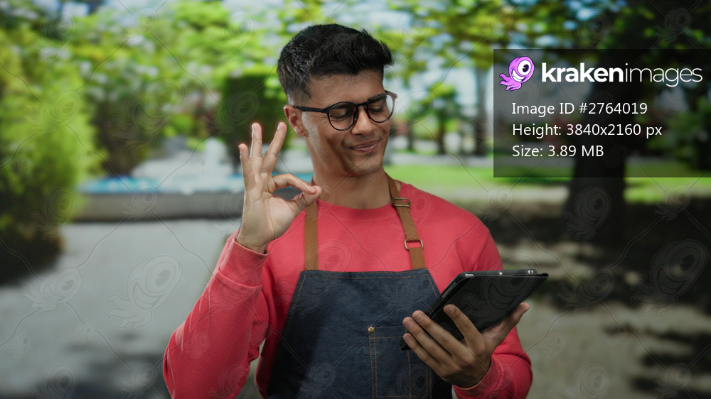 Young man in outdoor park wearing glasses, sweater, apron, holding tablet, gesturing okay sign, surrounded by trees, calm environment, sunny day.
