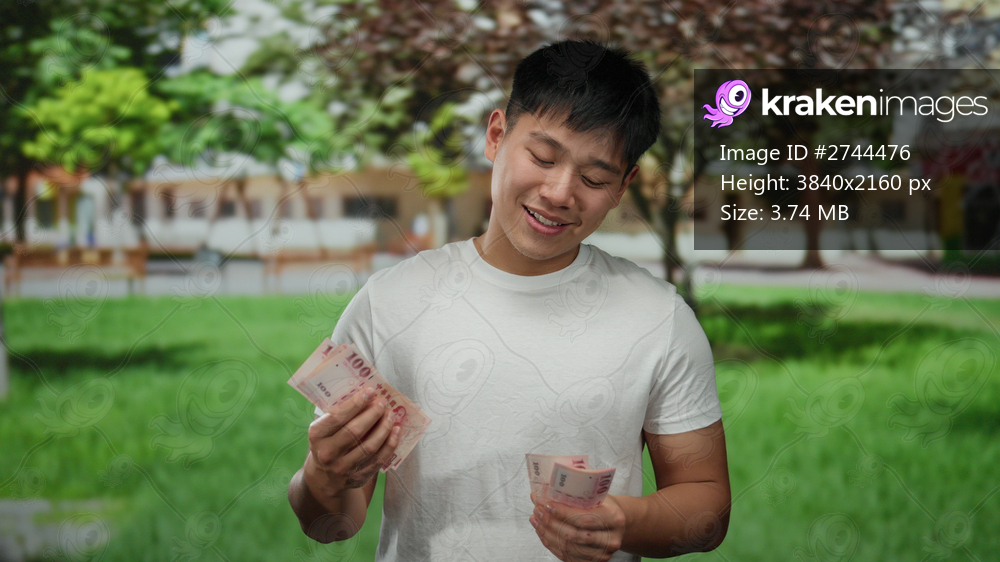 Young man in park counting taiwanese banknotes, smiling with trees and buildings in the background, showcasing financial success outdoors.