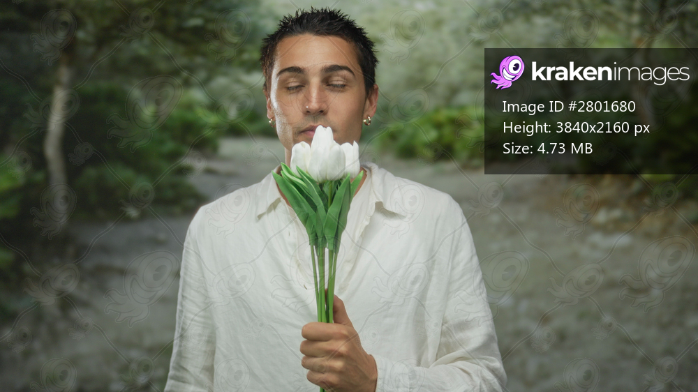 Young man in park holding white flowers, wearing a white shirt with trees in the background, creating a fresh and serene outdoor atmosphere.