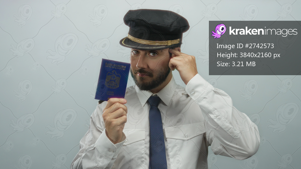 Young man in pilot uniform holding uae passport against white background, emphasizing travel, aviation, and international identification in a focused, professional setting. - Kraken Images