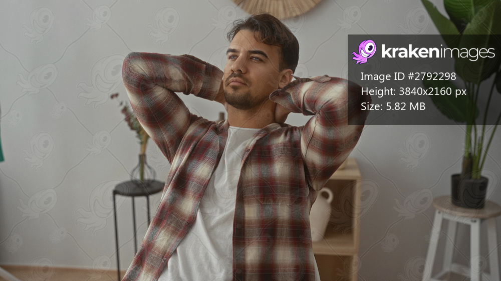 Young man in plaid shirt relaxing in an office setting with hands behind head, surrounded by indoor plants and decorative items, conveying a calm and thoughtful atmosphere. - Kraken Images