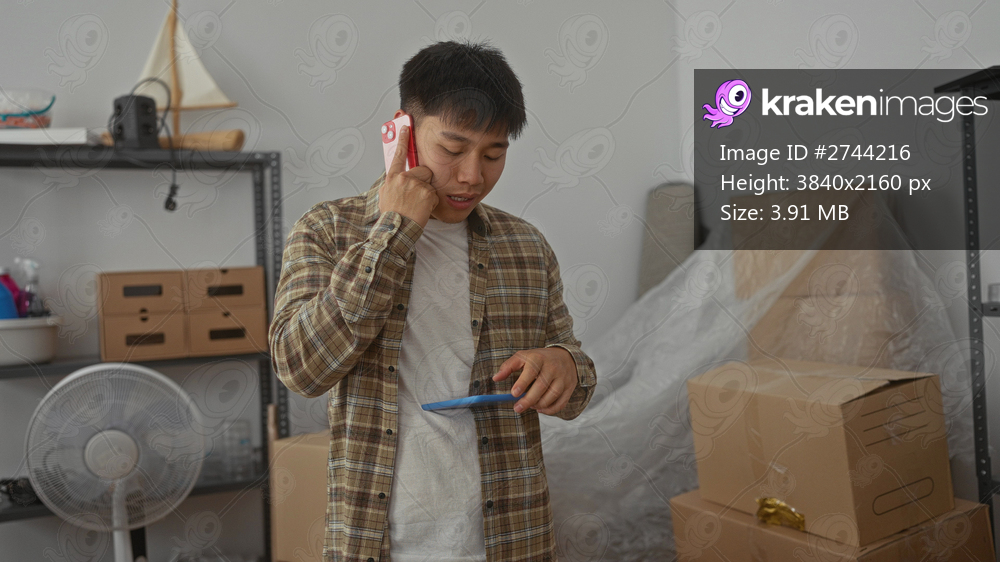 Young man in plaid shirt talks on phone and uses tablet in living room of new home surrounded by boxes and shelves indicating moving and settling process. - Kraken Images