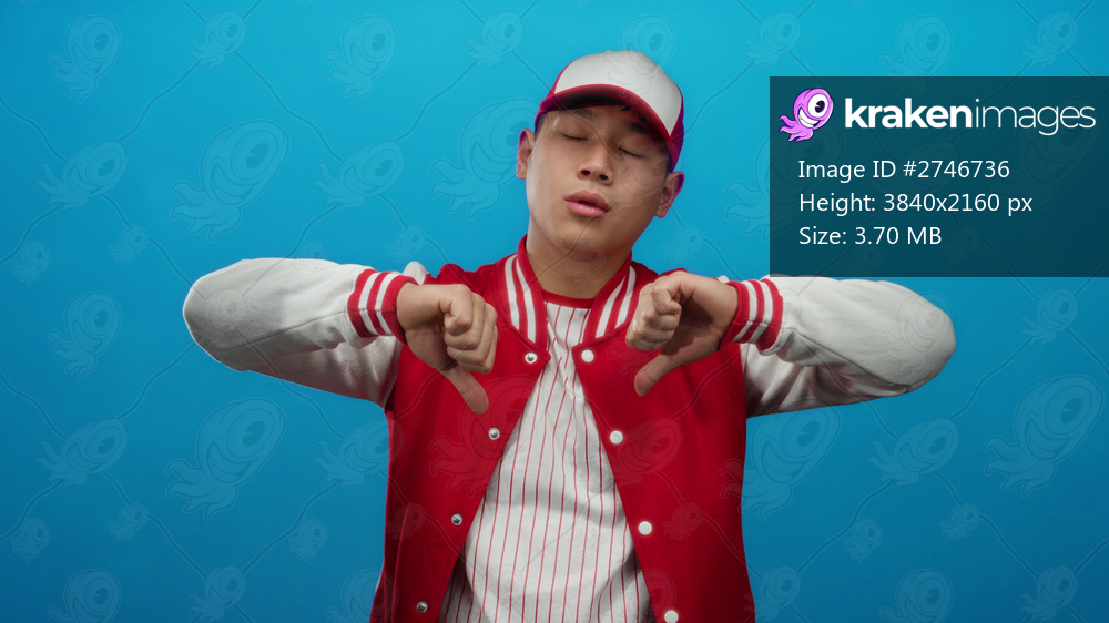 Young man in red baseball uniform against isolated blue background shows thumbs down gesture.