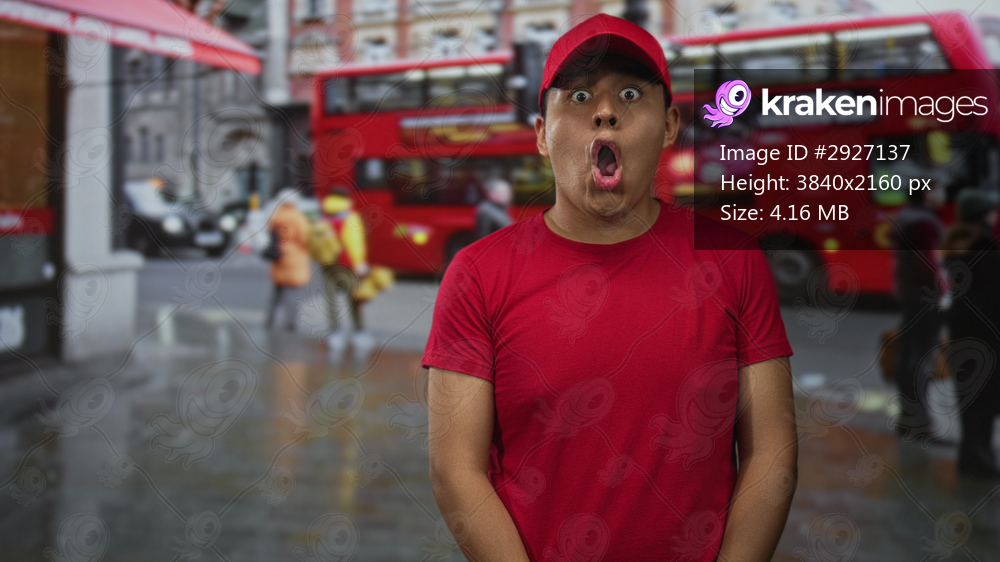 Young man in red cap and red t shirt with mouth open standing on city street by a red double decker bus; surprise urgency.