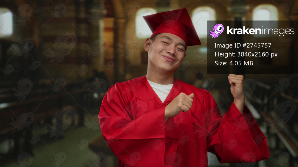 Young man in red graduation gown celebrating inside a church after graduation ceremony with a joyful expression and pointing thumbs behind him in a historic setting. - Kraken Images