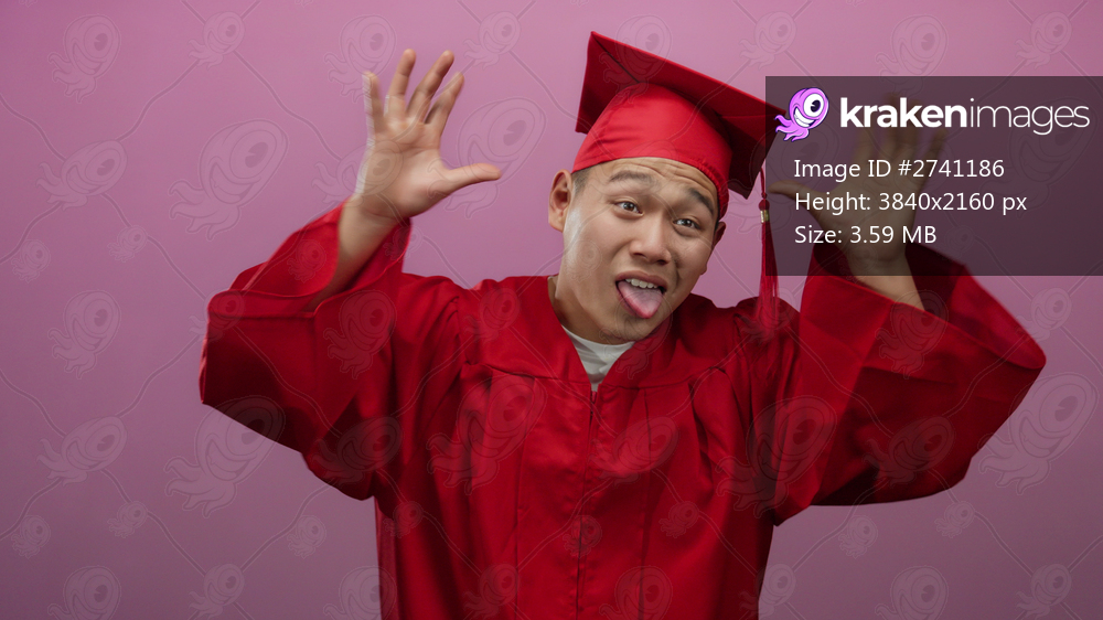 Young man in red graduation gown making playful faces against pink wall, celebrating graduation day.