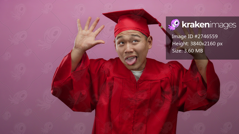 Young man in red graduation gown making playful faces against pink wall, celebrating graduation day.