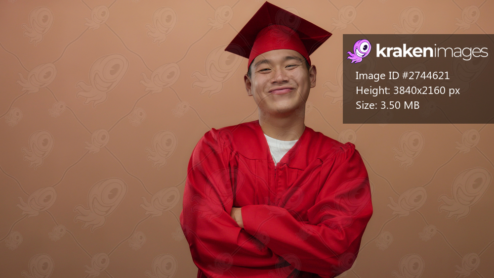 Young man in red graduation gown smiling confidently with arms crossed against an isolated brown wall background.