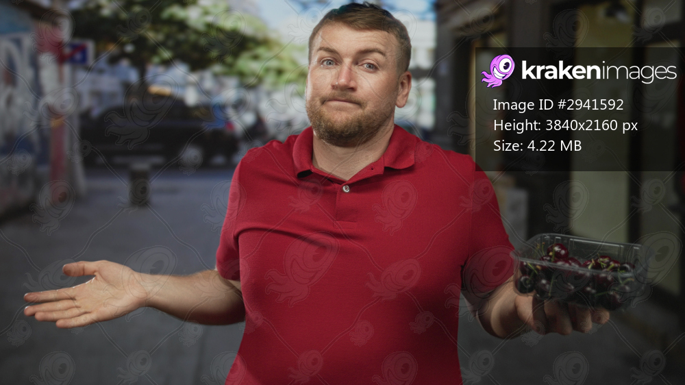 Young man in red polo holding container of cherries on street with hand on head looking down and squinting; uncertainty.