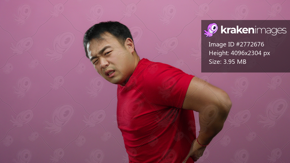 Young man in red shirt with back pain isolated against a vibrant pink wall, expressing discomfort as he grimaces, emphasizing health issues and body language. - Kraken Images