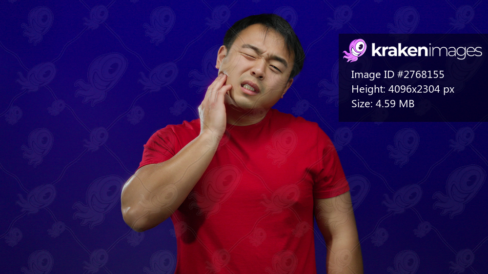 Young man in red shirt experiencing toothache against blue background, showing expressions of pain and discomfort, isolated and focused on his face.