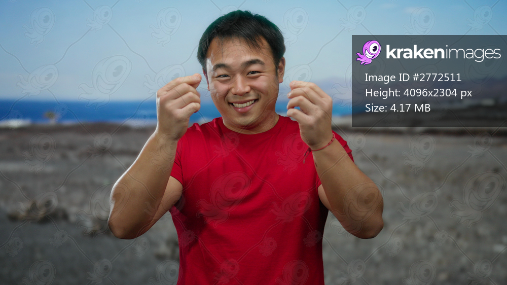 Young man in red shirt gestures money at seaside with a cheerful smile, showcasing a sunny beach background.