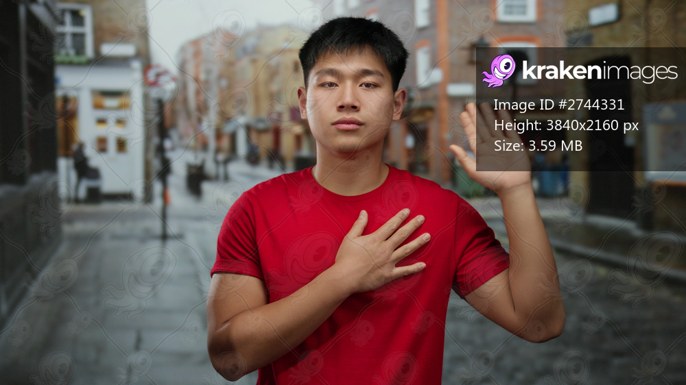 Young man in red shirt gestures on a city street, expressing emotion, against a backdrop of urban architecture and cobblestone pavement, capturing a vibrant outdoor scene. - Kraken Images