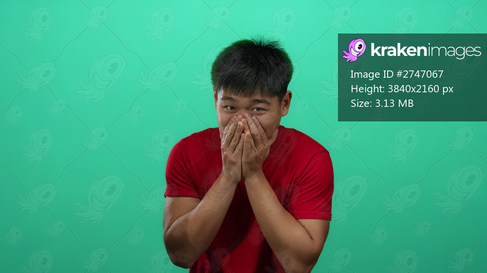 Young man in red shirt gesturing over isolated green background, asian male standing confidently with expressive hand movements and focused expression. - Kraken Images