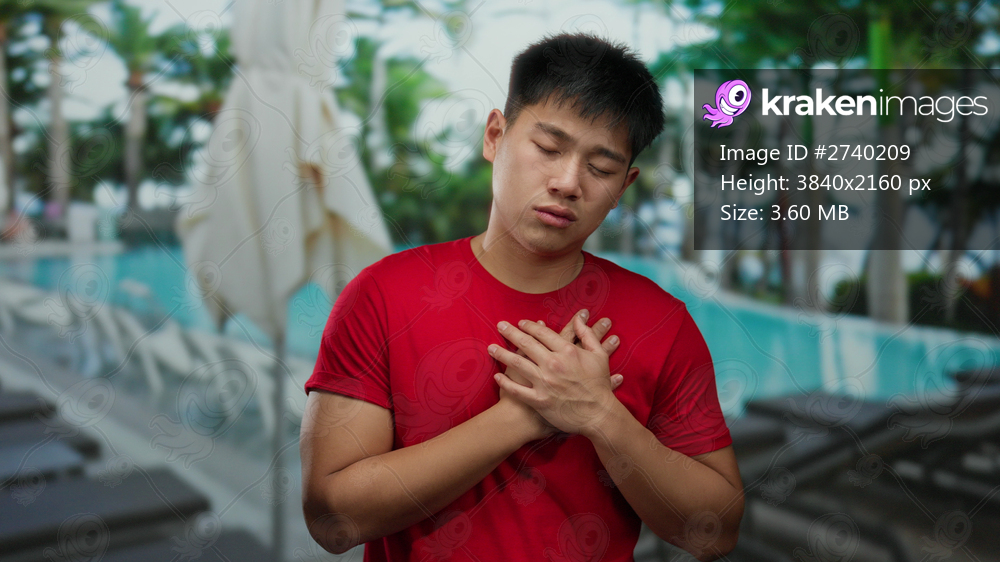 Young man in red shirt with hands on heart stands by a pool in a tranquil outdoor resort setting surrounded by palm trees and empty lounge chairs under neutral parasols at a hotel. - Kraken Images