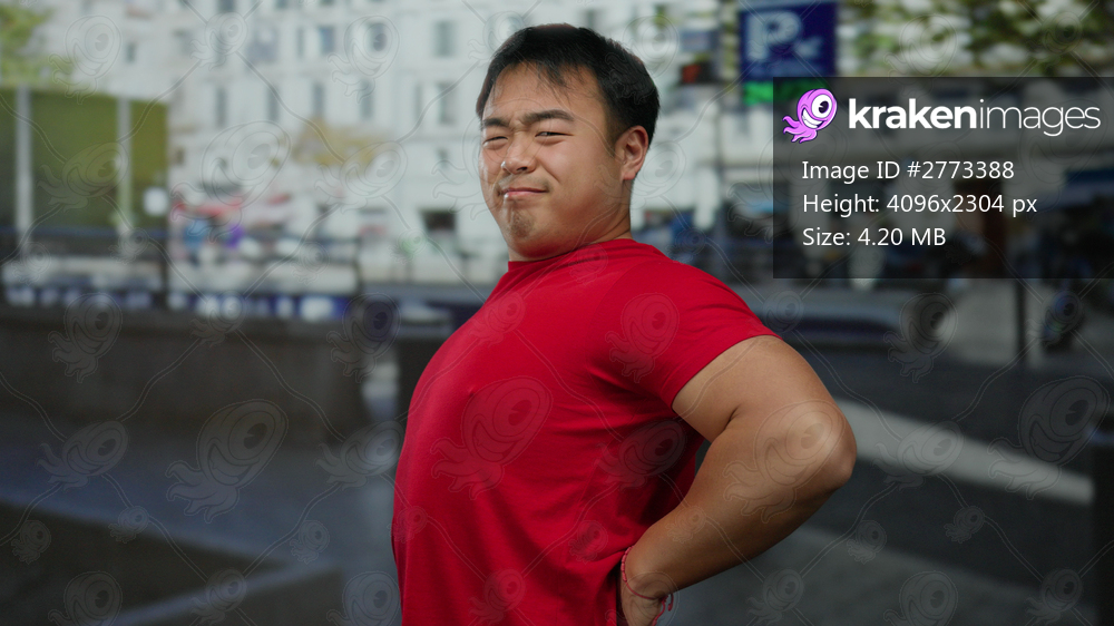 Young man in red shirt holds his back in pain on a city street expressing discomfort in an urban environment.