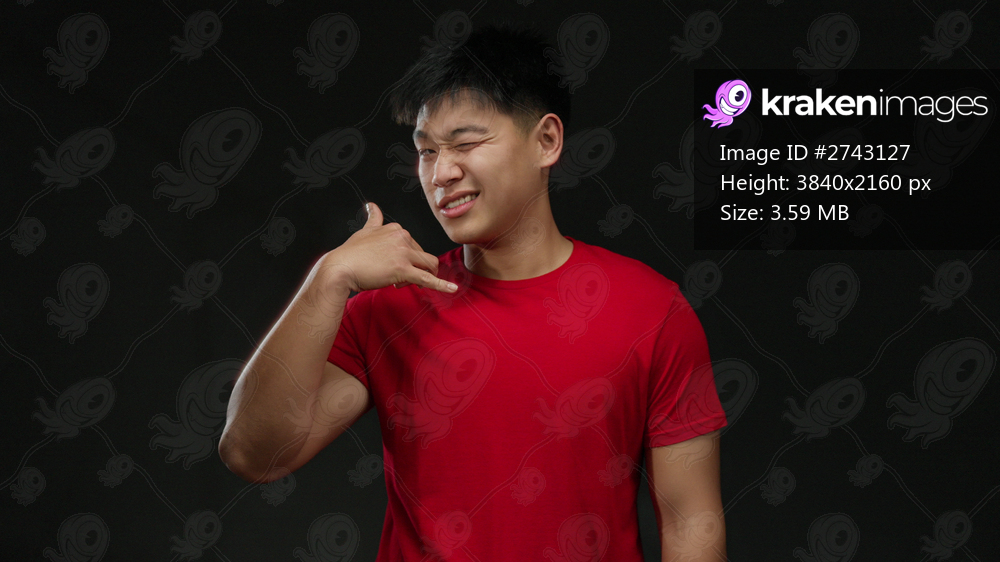 Young man in red shirt makes a phone gesture against a black background, showcasing a communication concept with an expressive and isolated pose.