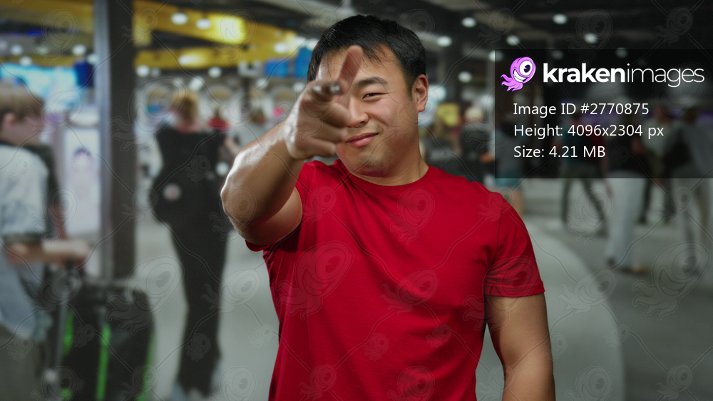 Young man in red shirt makes hand gesture in busy airport terminal with blurred travelers and bright lighting, conveying a sense of travel humor.