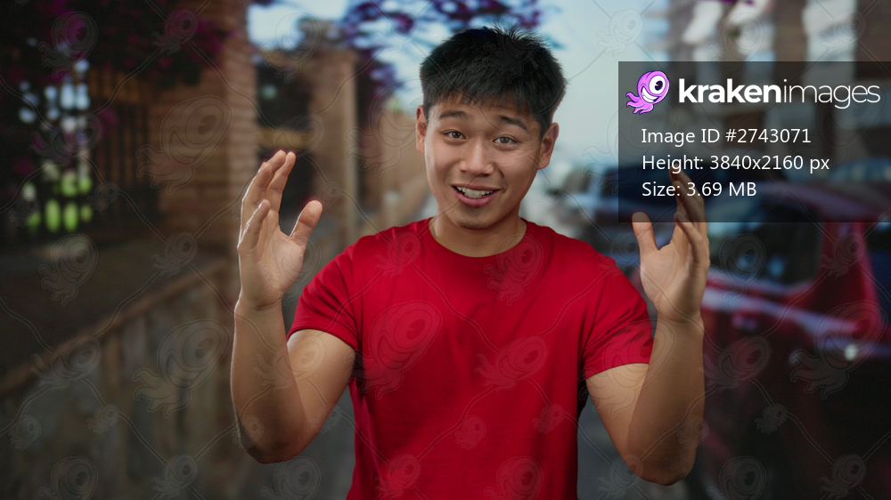 Young man in red shirt makes large gesture enthusiastically on city street with cars in background, showcasing excitement and engagement outdoors.