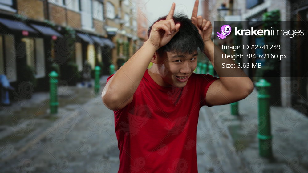 Young man in red shirt making a horns gesture while standing in a lively urban street setting, surrounded by colorful buildings and a cheerful atmosphere. - Kraken Images