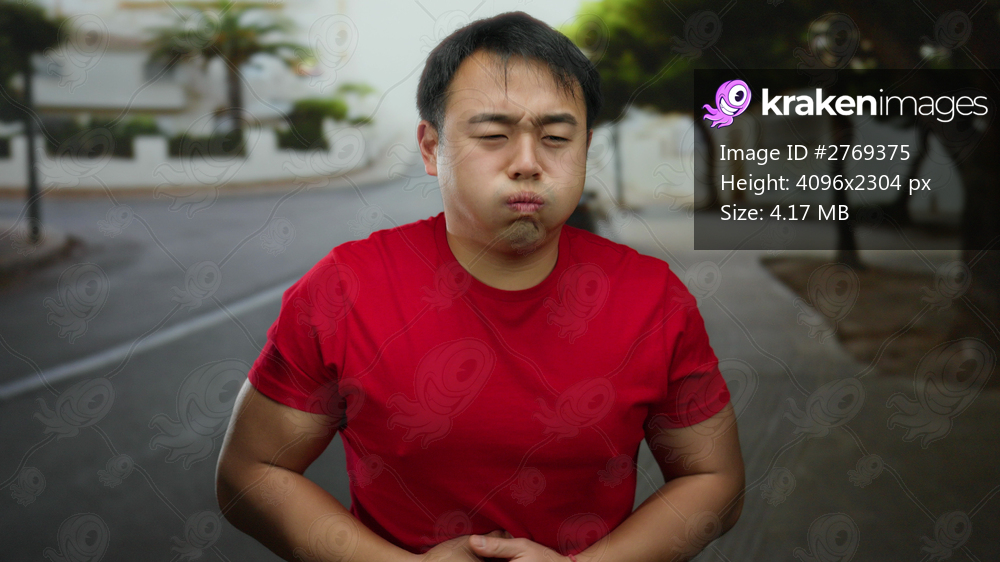 Young man in red shirt on urban street showing uncomfortable expression under bright daylight in city setting with blurred trees and buildings in background. - Kraken Images