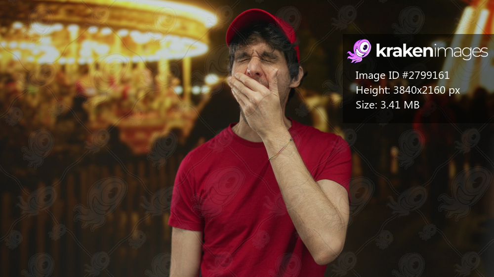 Young man in red shirt pinches nose with hand under bright fairground lights on crowded street at night; disgust.