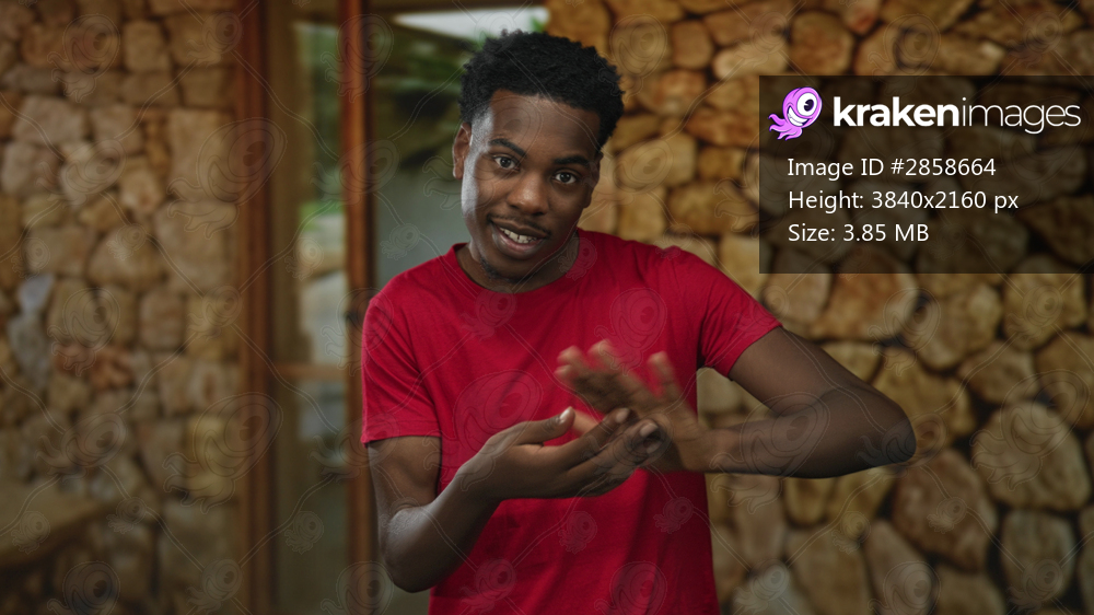 Young man in red shirt rubbing fingers gesture for money in building entrance; money greed prosperity.