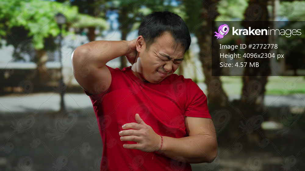 Young man in red shirt showing discomfort outdoors in a park setting with blurred trees in the background.
