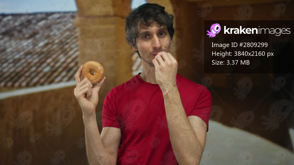 Young man in red shirt smiles and holds glazed donut with hand to mouth bite outside historic university building entrance; hunger satisfaction joy.