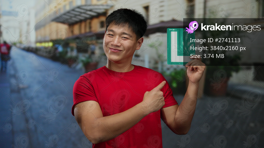 Young man in red shirt smiling and holding learner plate on busy city street highlighting vibrant urban scene and diverse cultural experience outdoors. - Kraken Images