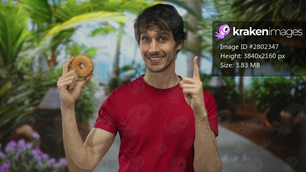 Young man in red shirt smiling holds glazed donut by face and points index finger in forest; enthusiasm.