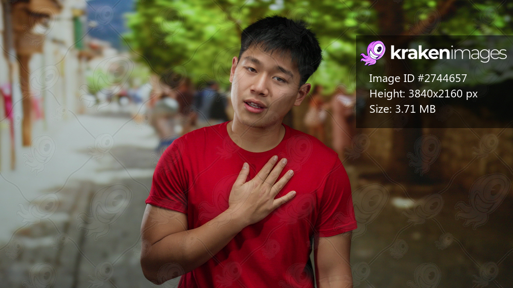 Young man in red shirt stands on city street expressing emotion with hand on chest, surrounded by blurred people and trees under bright outdoor lighting - Kraken Images