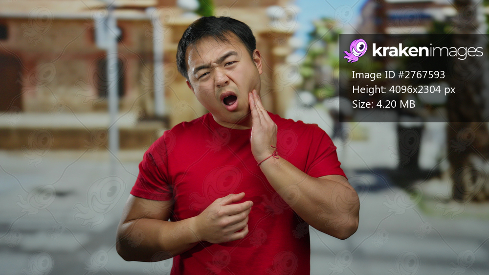 Young man in red shirt suffers toothache on city street with blurred urban background, expressing discomfort with pain in expression.