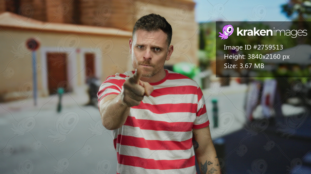 Young man in red striped shirt gestures expressively on urban street with tattoos visible on arm