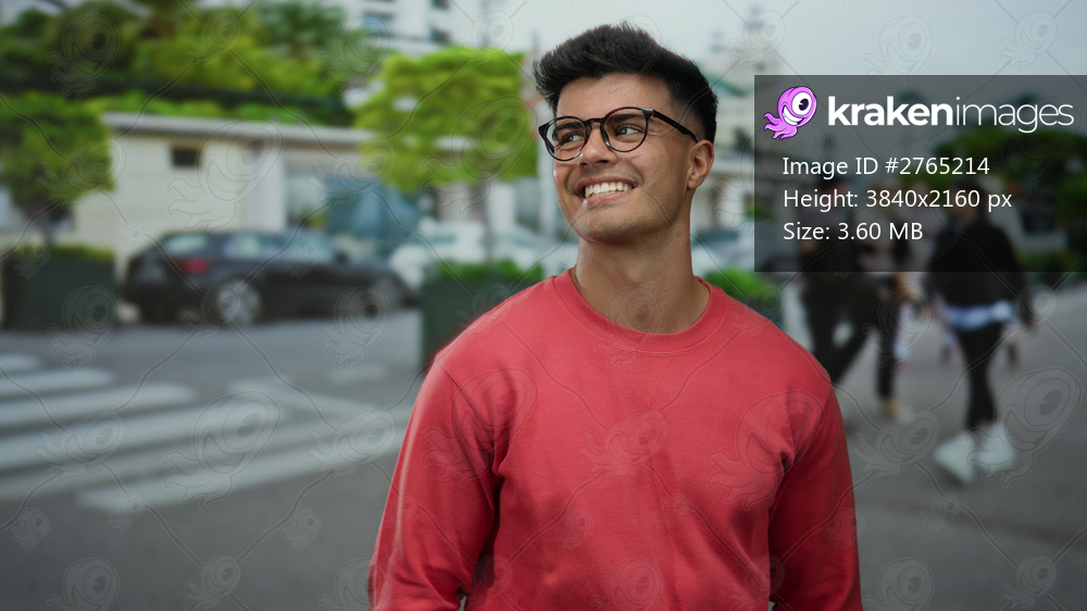 Young man in red sweater smiles confidently outdoors in an urban city street with lush greenery and modern architecture blurred in the background.