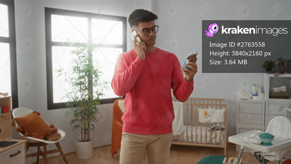 Young man in red sweater speaks on phone in well-lit bedroom holding medicine bottle near baby crib with toys, plants, and clock visible in cozy indoor setting. - Kraken Images