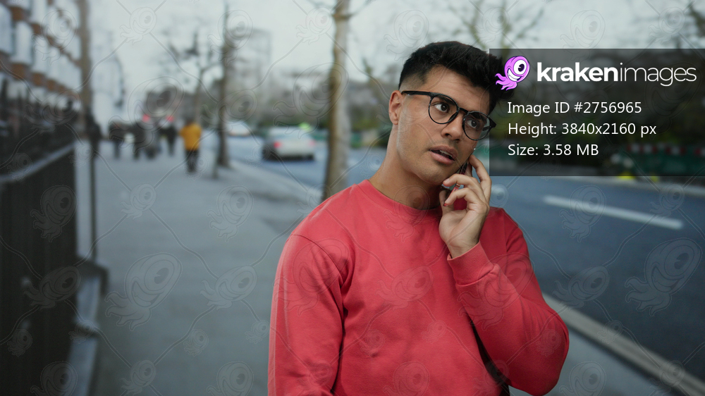 Young man in red sweater talking on phone in a city street with red double-decker buses in the background