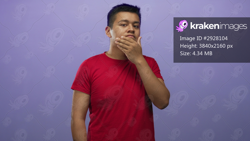 Young man in red t shirt touching chin with hand in studio against purple backdrop; thoughtful introspection.