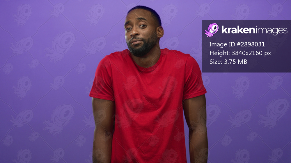 Young man in red tshirt shrugs shoulders and gazes uncertainly in a purple studio backdrop; doubt casual.