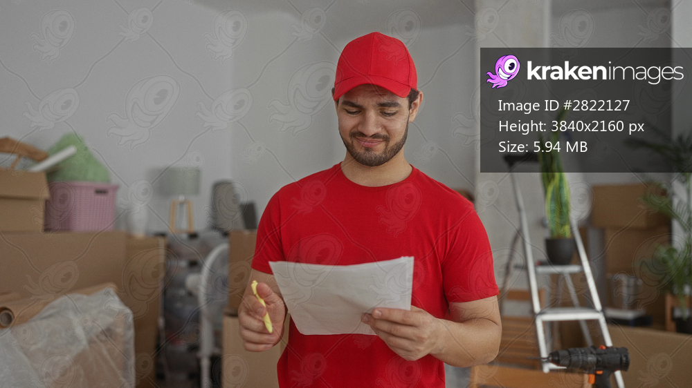 Young man in red uniform reviewing and pointing at delivery papers in a building interior; diligence.