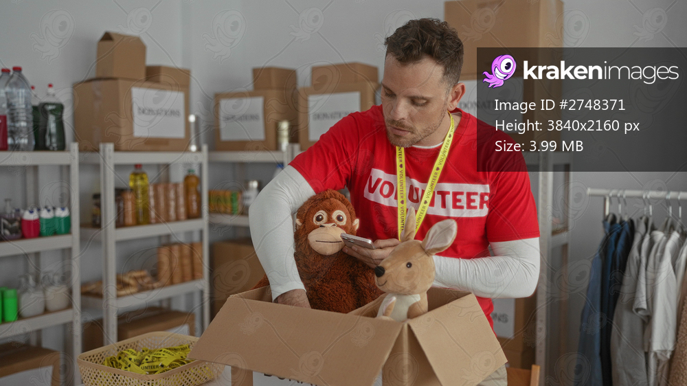 Young man in red volunteer shirt organizes stuffed animals in donation room with shelves filled with food and boxes.