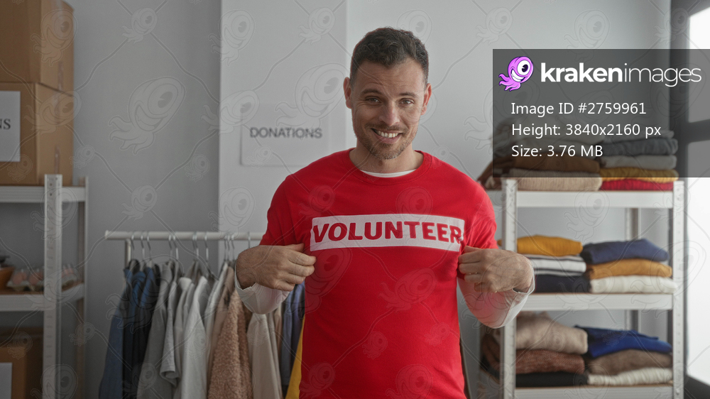 Young man in red volunteer shirt points and gives thumbs up indoors at a donation center surrounded by clothes and boxes, showing enthusiasm and dedication. - Kraken Images