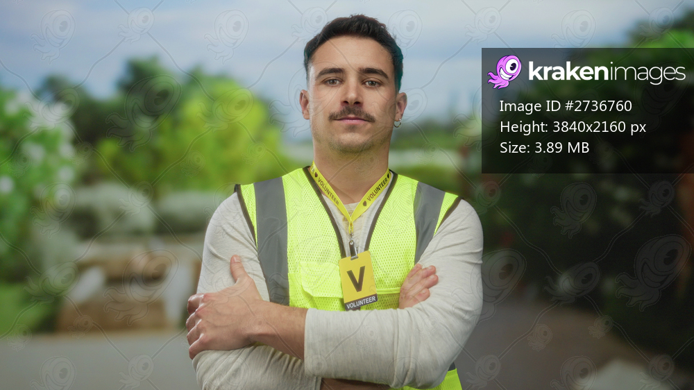 Young man in reflective vest with arms crossed stands confidently outdoors in a city setting as a volunteer, embodying community service and teamwork spirit. - Kraken Images